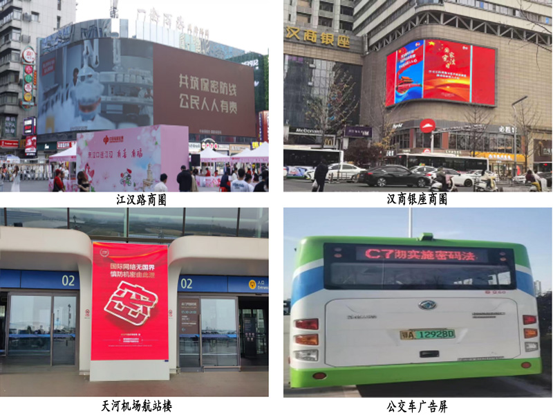 “12.4”国家宪法周活动期间,武汉市国家保密局联合市交通局、市城管委、市公交集团、机场集团在全市出租车车顶电子屏、户外商圈显示屏、全市631个公交候车亭、天河机场LED宣传屏等播放保密公益宣传片及宣传标语,扩大了保密宣教的影响力和传播力。
