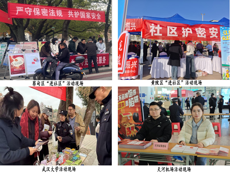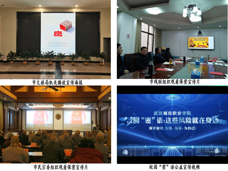 武昌区、青山区、汉阳区、硚口区、蔡甸区、黄陂区、新洲区、东湖风景区等深入本地高校、社区组织开展保密普法宣传活动,通过发放保密宣传资料、有奖竞猜、现场问答等形式普及保密常识,不断增强学校师生、社区民众保密知识。市直各单位利用机关内部宣传栏、电子显示屏张贴保密宣传标语、播放保密公益宣传片。武汉城市职业学院聚焦学校工作生活中的保密风险点,组织师生精心拍摄保密宣传片《校园密语-这些风险就在身边》,筑牢师生思想第一道防线。