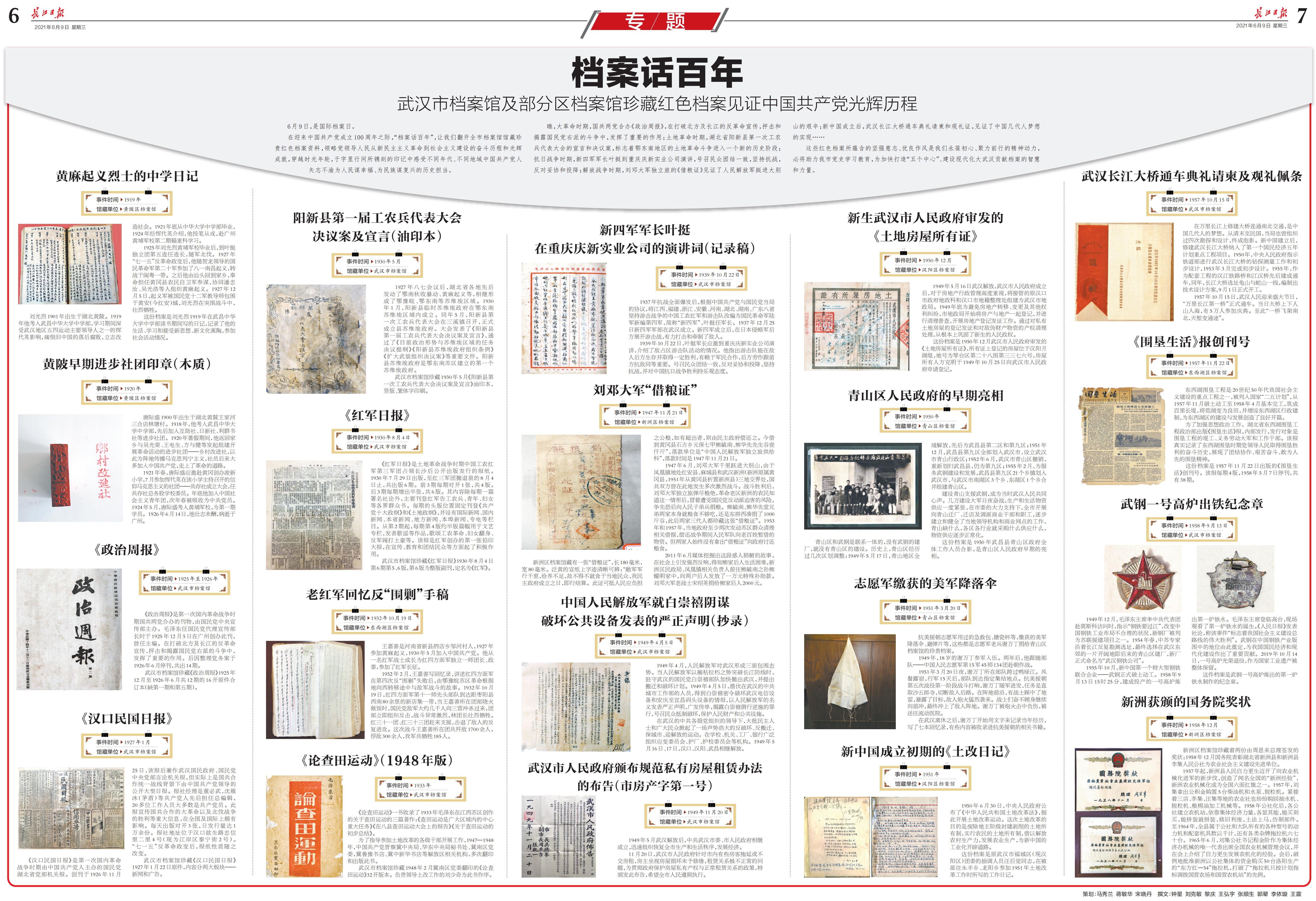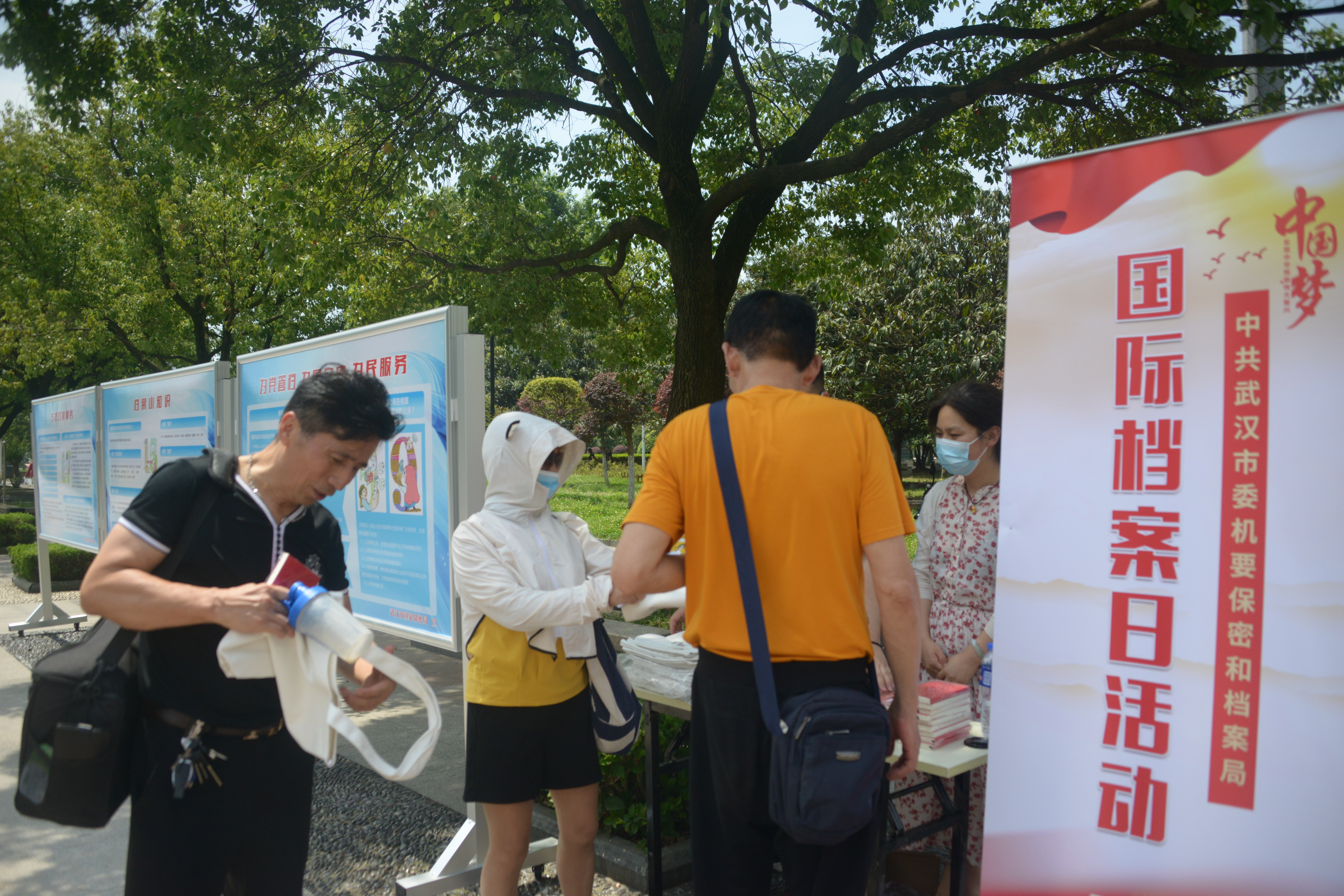 在第十四个“6.9”国际档案日来临之际,武汉市以“档案话百年”为主题,集中开展档案宣传活动:一是在武汉电视台、大型户外广场电子宣传屏和121家影院,集中播放《档案法》公益宣传片一个星期;二是在武汉江滩集中现场宣传,组织9块档案普法展板,向来往市民发放《中国精神》书籍和文创产品,宣传档案法律知识;三是在《长江日报》刊发“档案话百年”专版,从市区档案馆精选20幅珍藏红色档案,与读者共同分享党的光辉历史;四是组织全市档案系统干部,收看国家档案局举办的线上档案专题讲座;五是在全市档案系统组织档案知识测试;六是安排局机关干部,深入基层档案普法讲座。市区档案部门也集中开展了系列档案宣传活动,在全市营造了深厚的《档案法》宣传教育氛围。