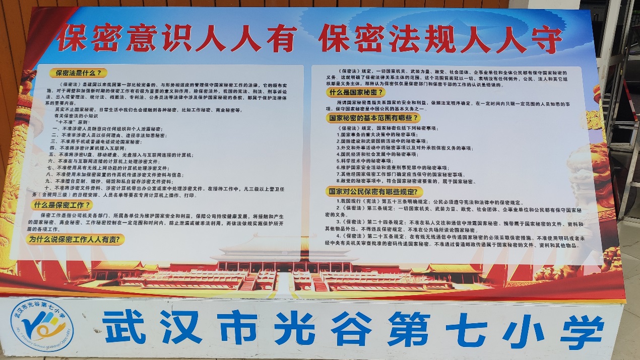 五是全媒体宣传有声有色。充分利用中国光谷、光谷政务等融媒体,政务APP、门户网站等线上资源,联合宣传部、城管局、教育局、政务局、光谷交通等部门,在政务大厅、光谷广场等商业区、公园广场显示屏,学校电子显示屏、机关大楼显示屏、轨道交通显示屏,滚动播放保密宣传海报、视频、标语等,达到国家安全教育“报、网、端、微、屏”等媒体平台全覆盖。