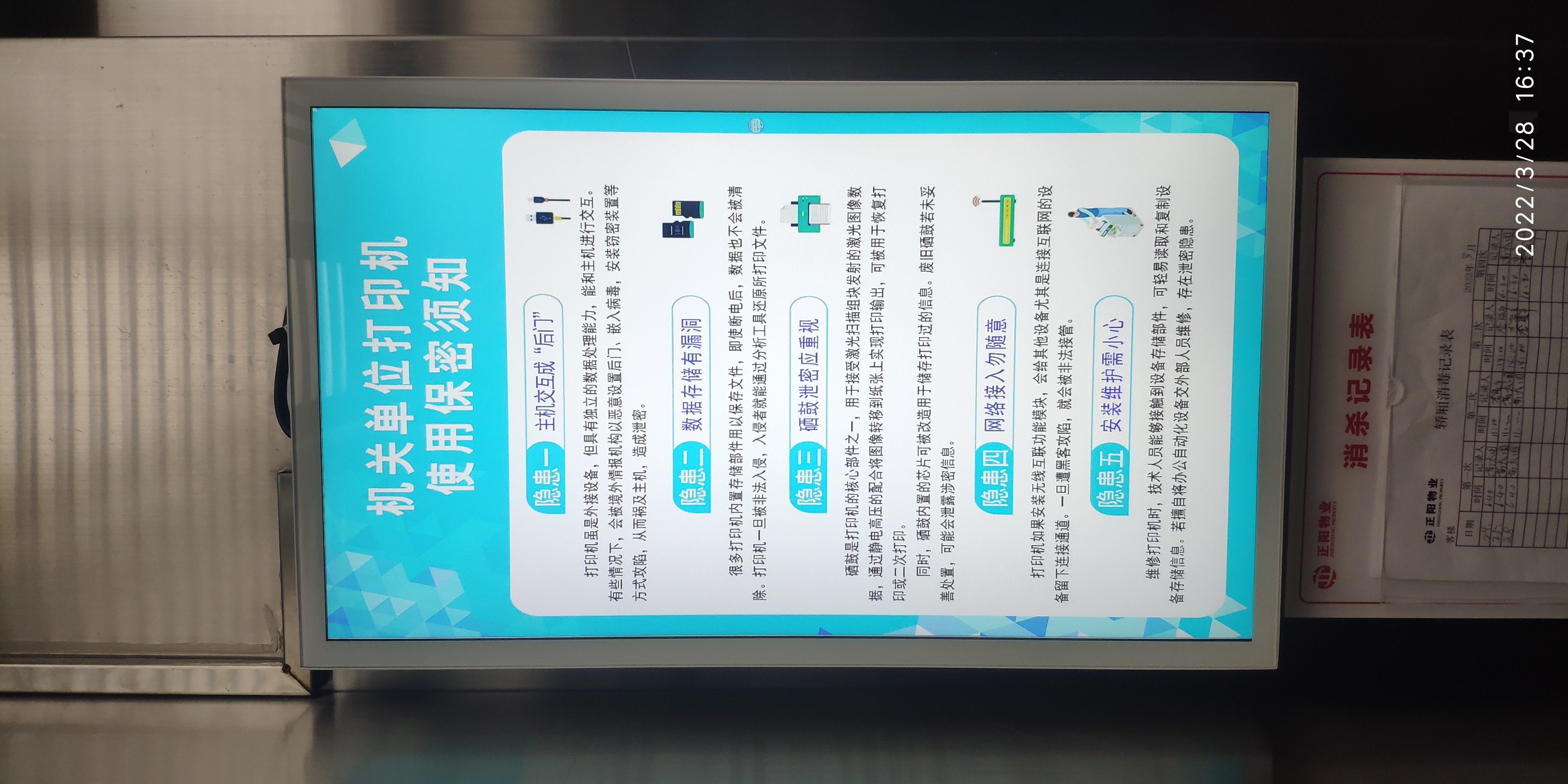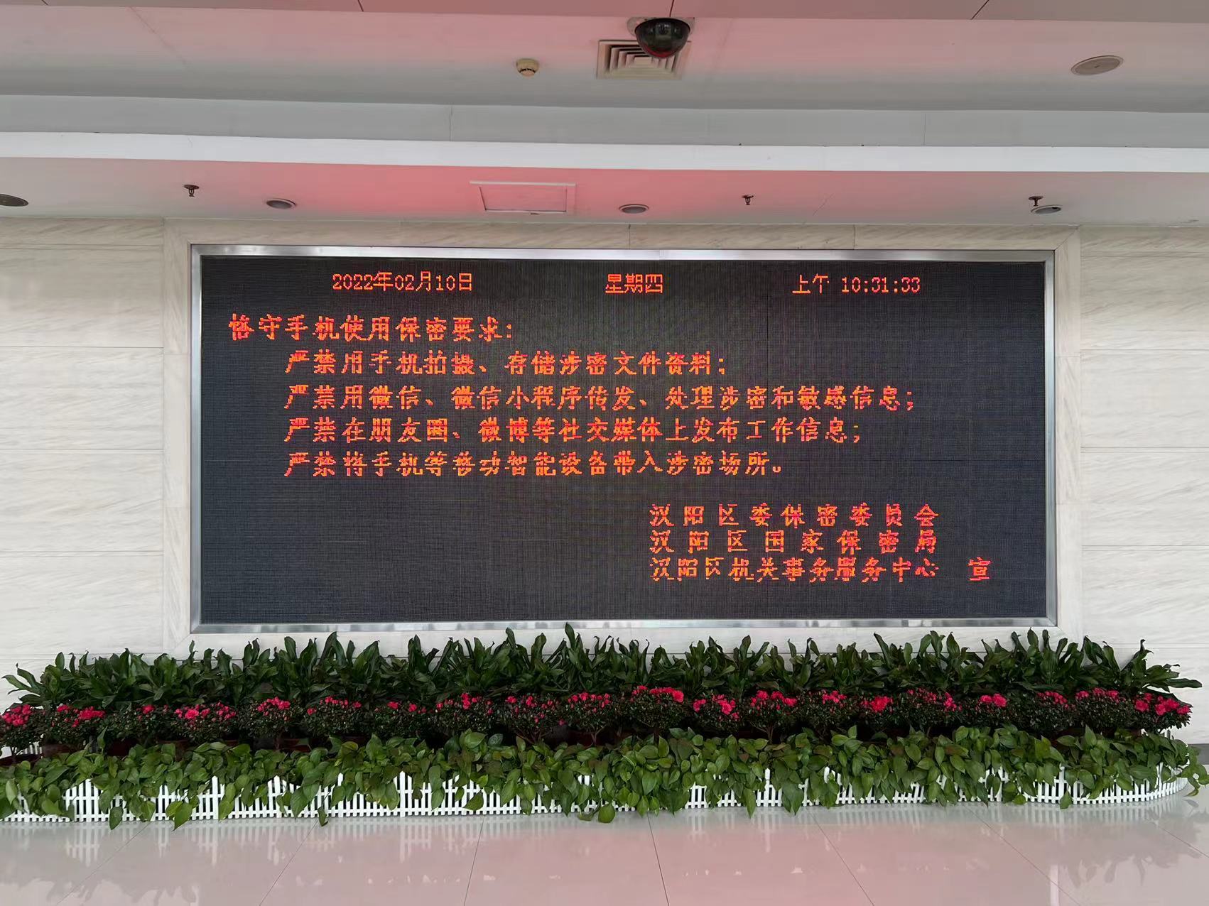 三是巧用资源、推广扩宣。充分利用机关大楼一楼大厅LED屏、区机关大楼及知音大厦电梯宣示屏轮播保密宣传标语,利用区委办公室档案陈列室开设影视教育课堂,播放保密教育系列宣传片,借助区政府协同办公OA平台开设“保密宣传”专栏,不定期向全区干部推送保密知识、常识,营造浓厚的学习宣传氛围。